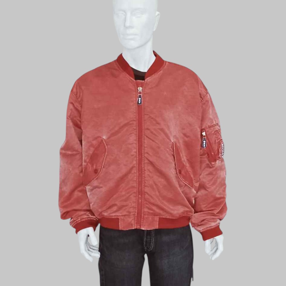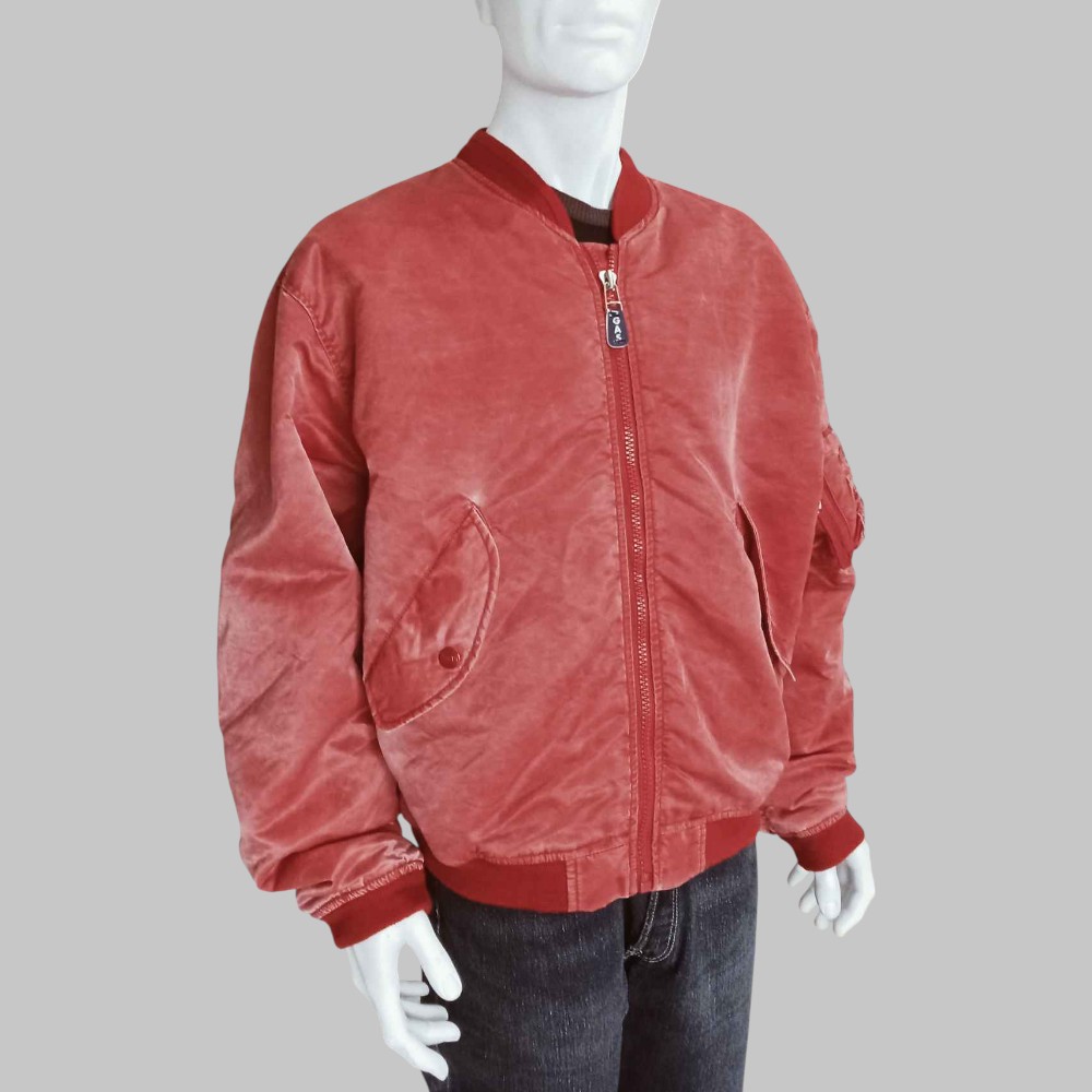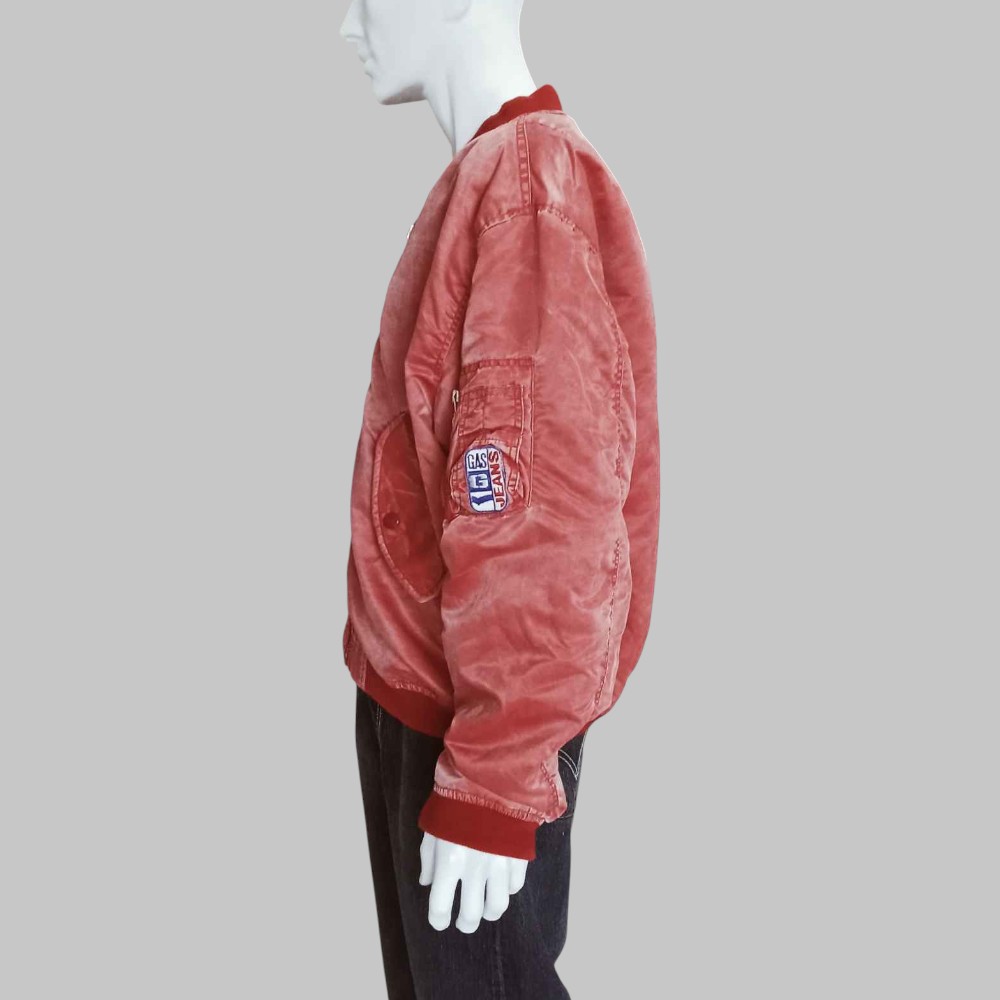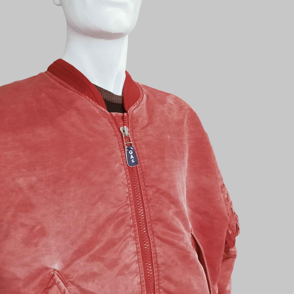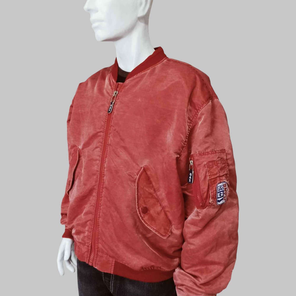 Waterproof jacket, Bomber style, light padding, lined, two internal and two external pockets, round neck, long sleeve, one zip pocket on the left sleeve with logo, visible color fading