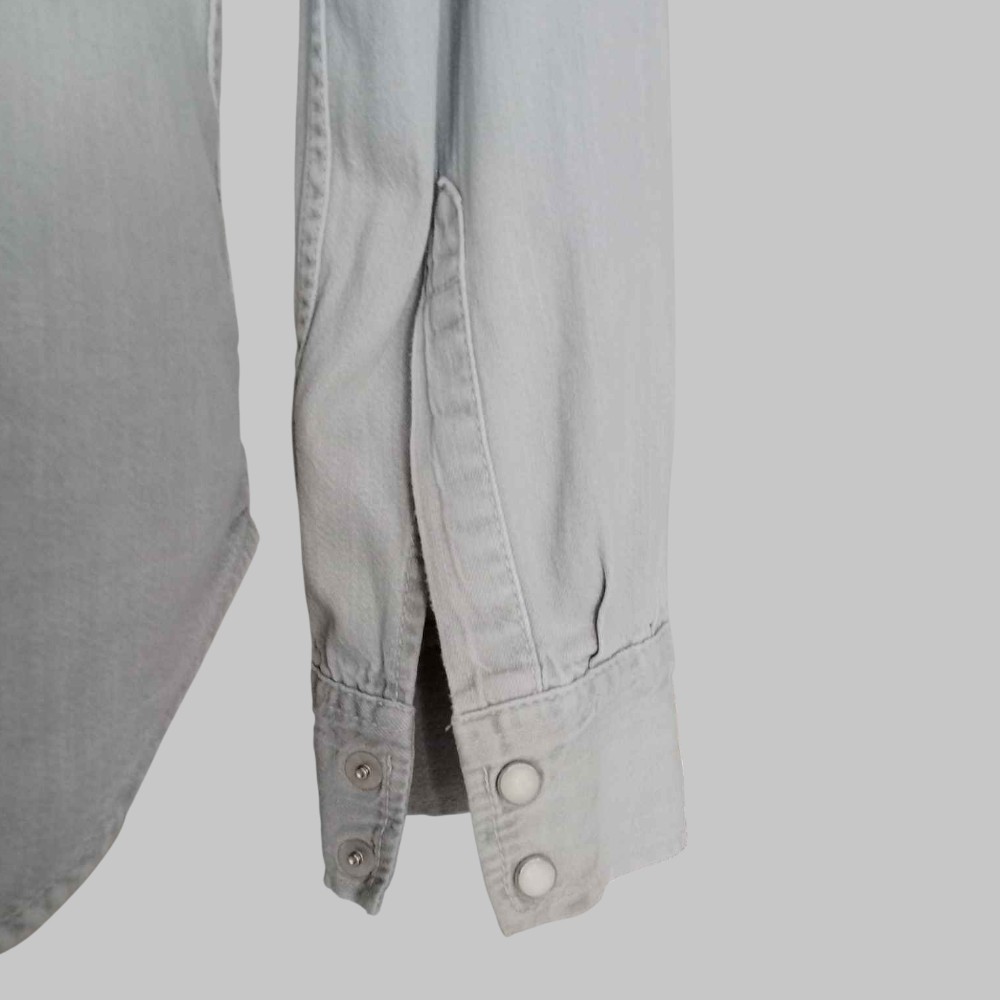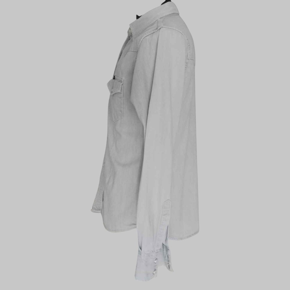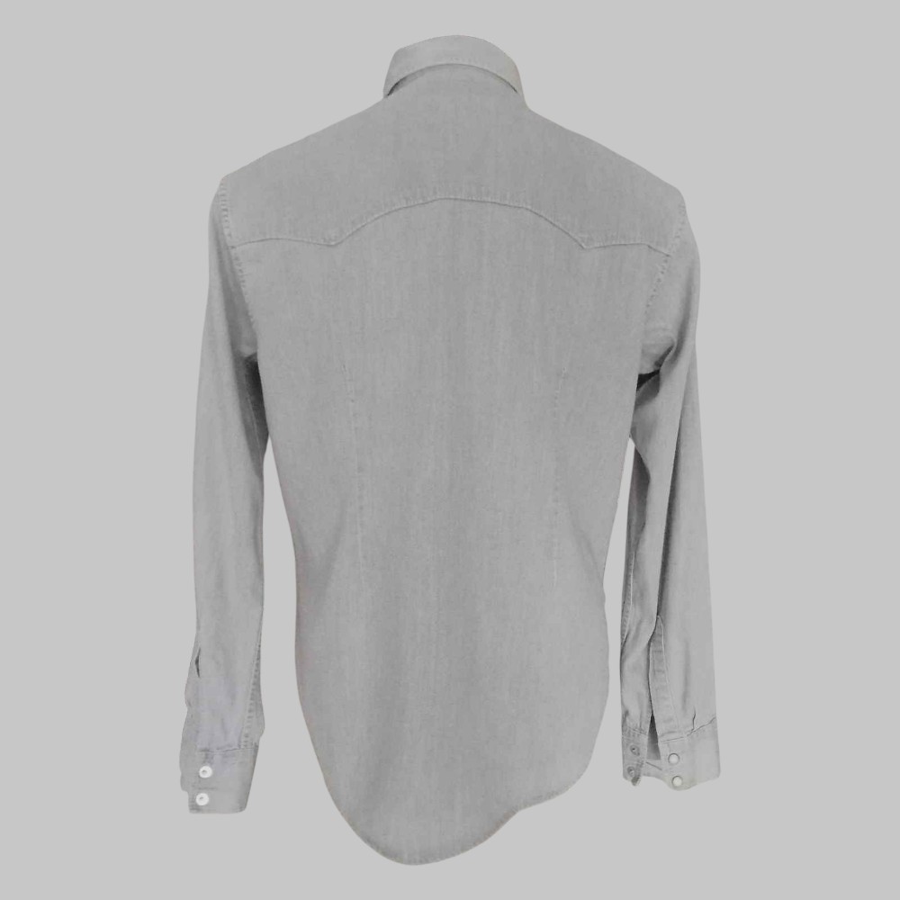 Solid colour denim shirt Two front pockets Clip button closure