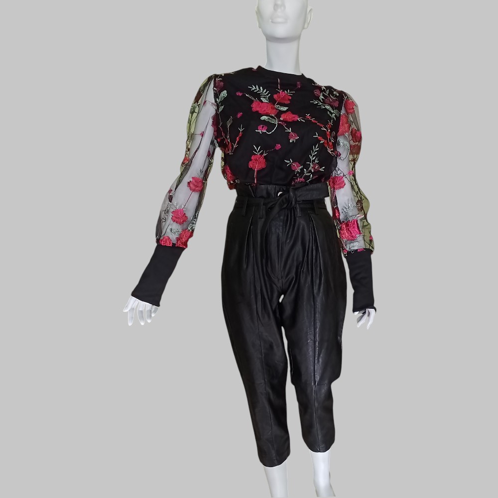 Faux leather capri pants. High gathered waist with strap Zip and button closure Two pockets
