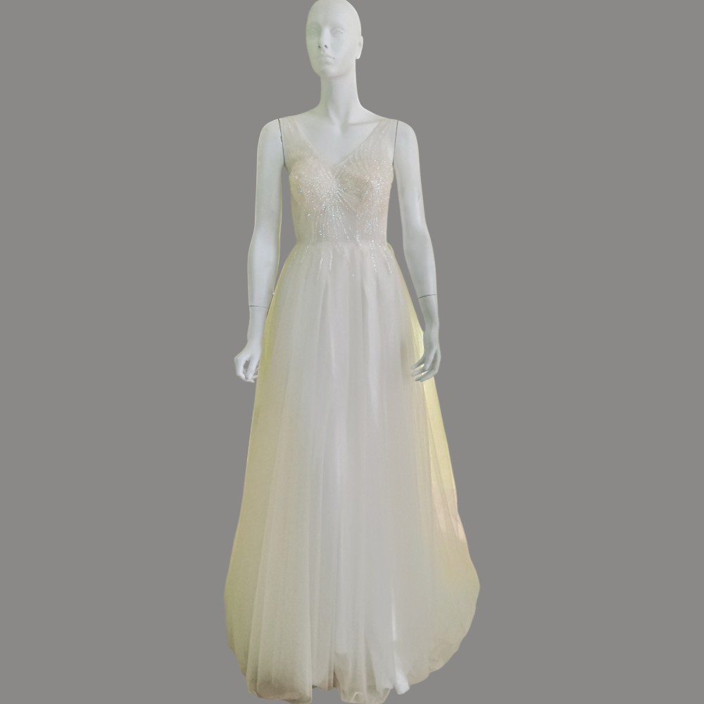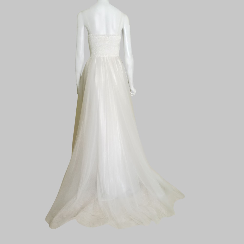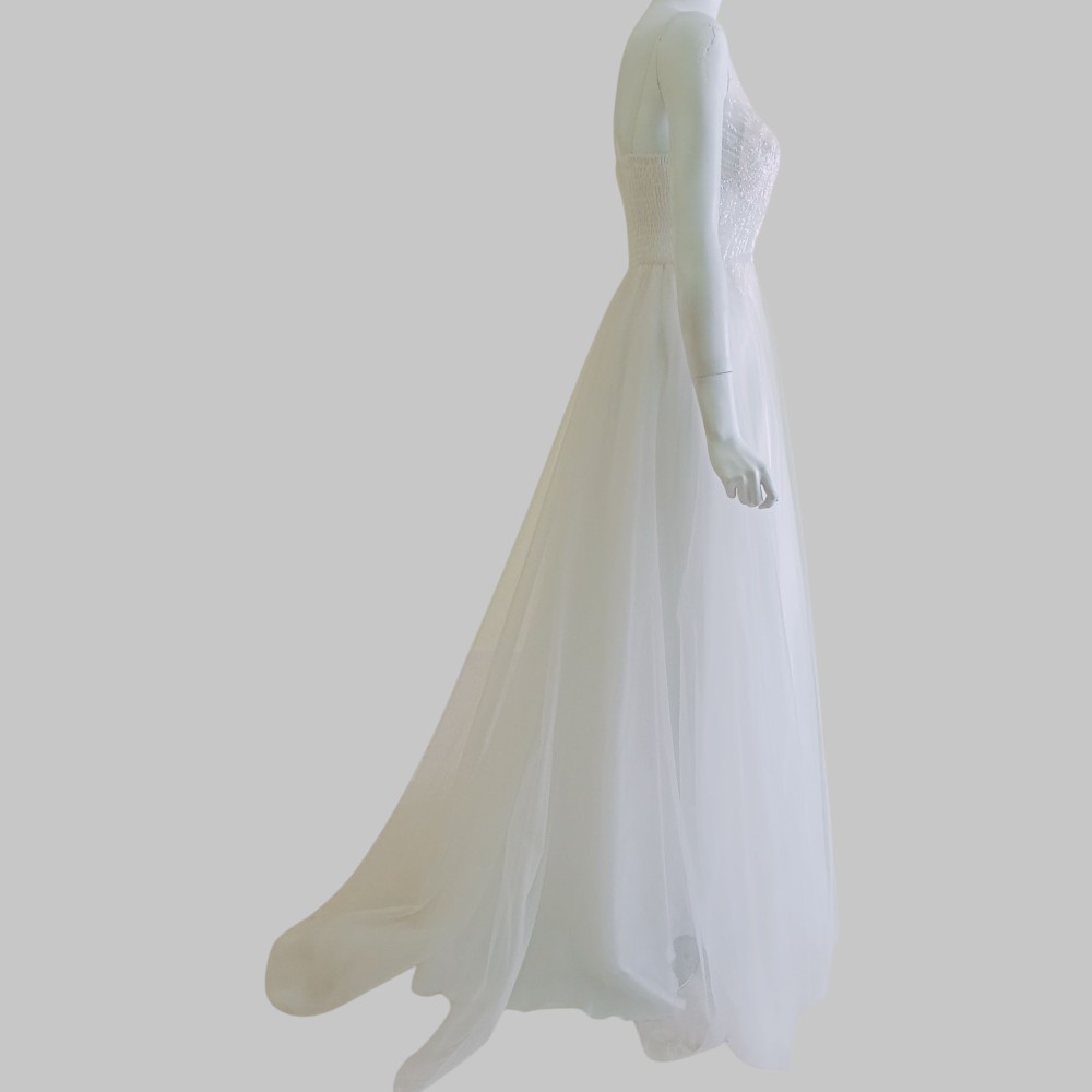 Foderato con tre strati di tulle bianco ed uno strascico di 145 cm dalla vita in giù.