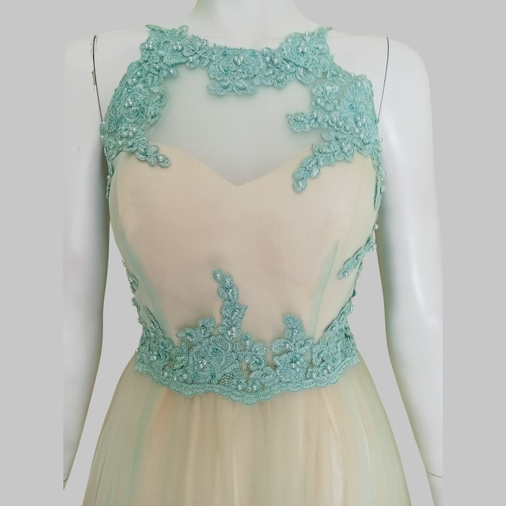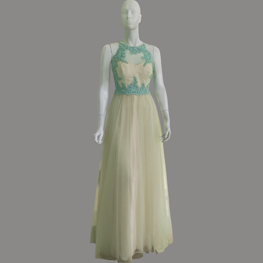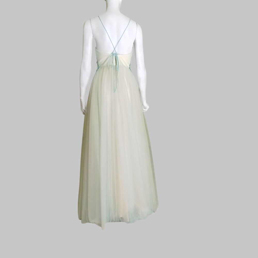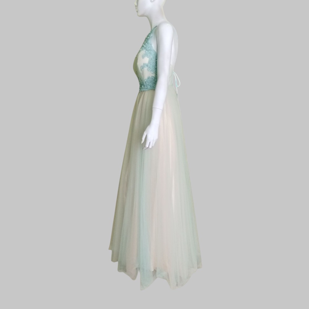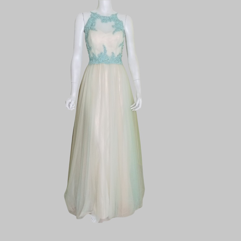 Abito da sposa  con corpetto ricamato color celeste e stringhe di chiusura sulla schiena. Corpetto con coppe. Foderato Due strati di tulle di cui uno con sfumature leggere di celeste