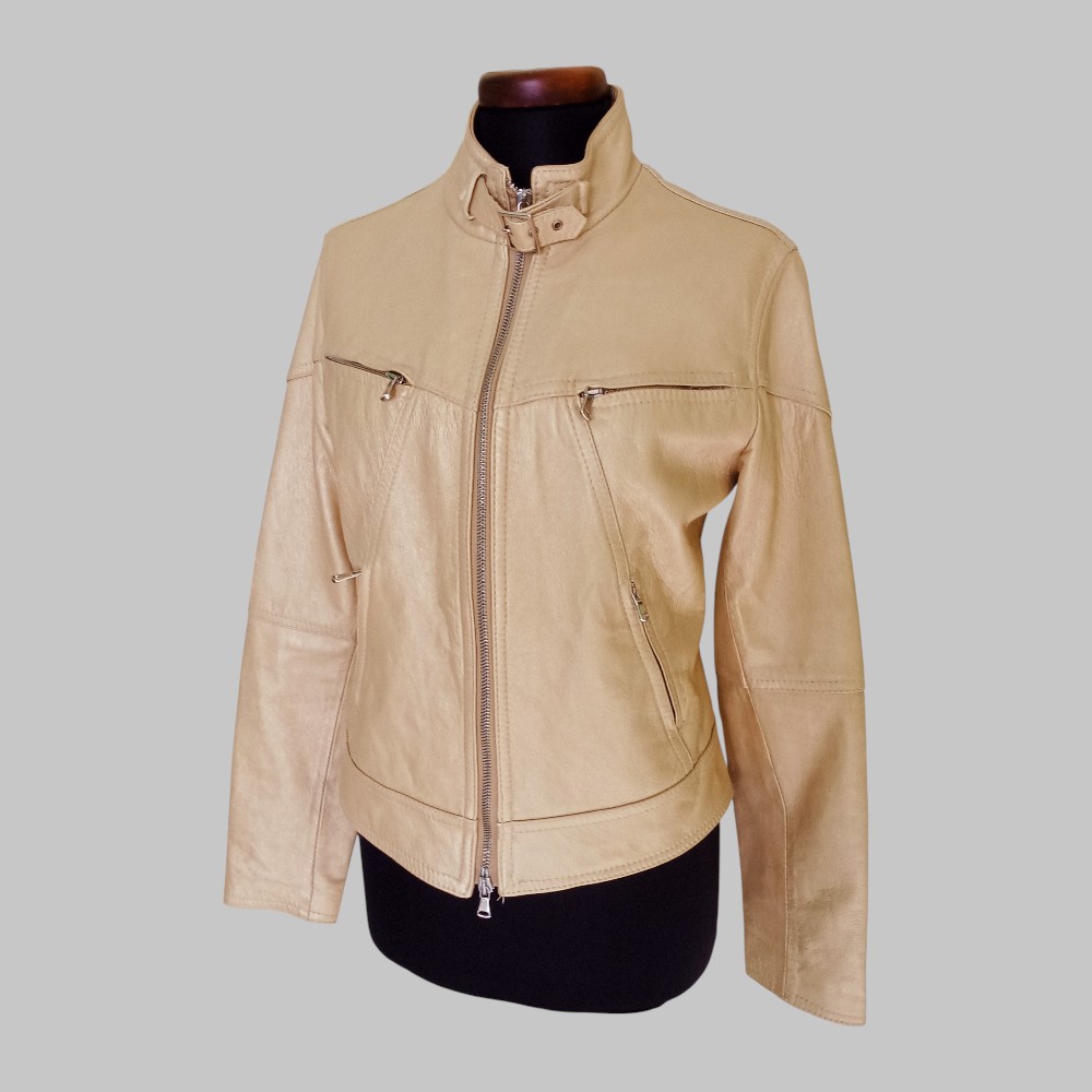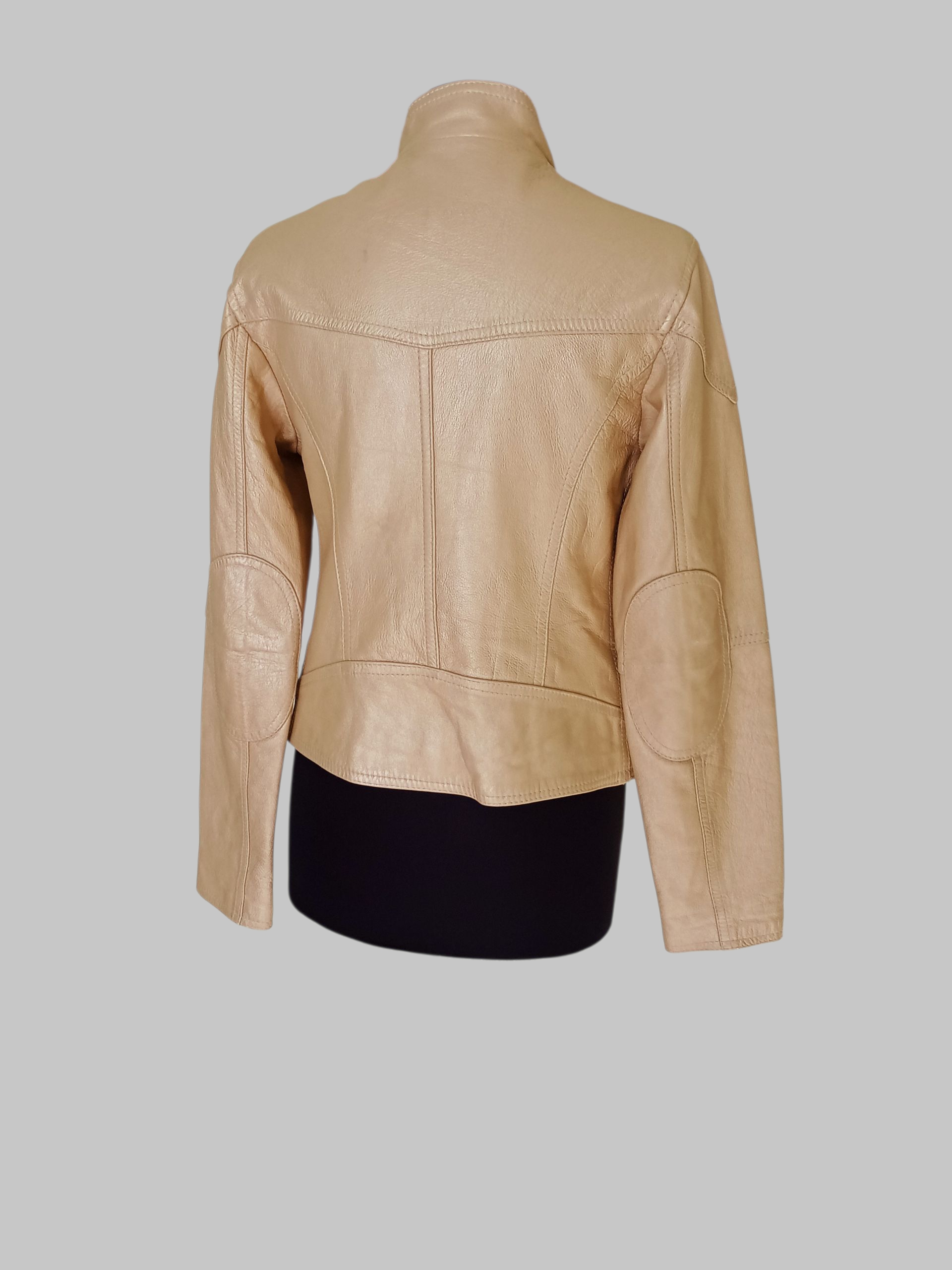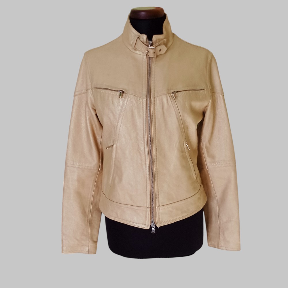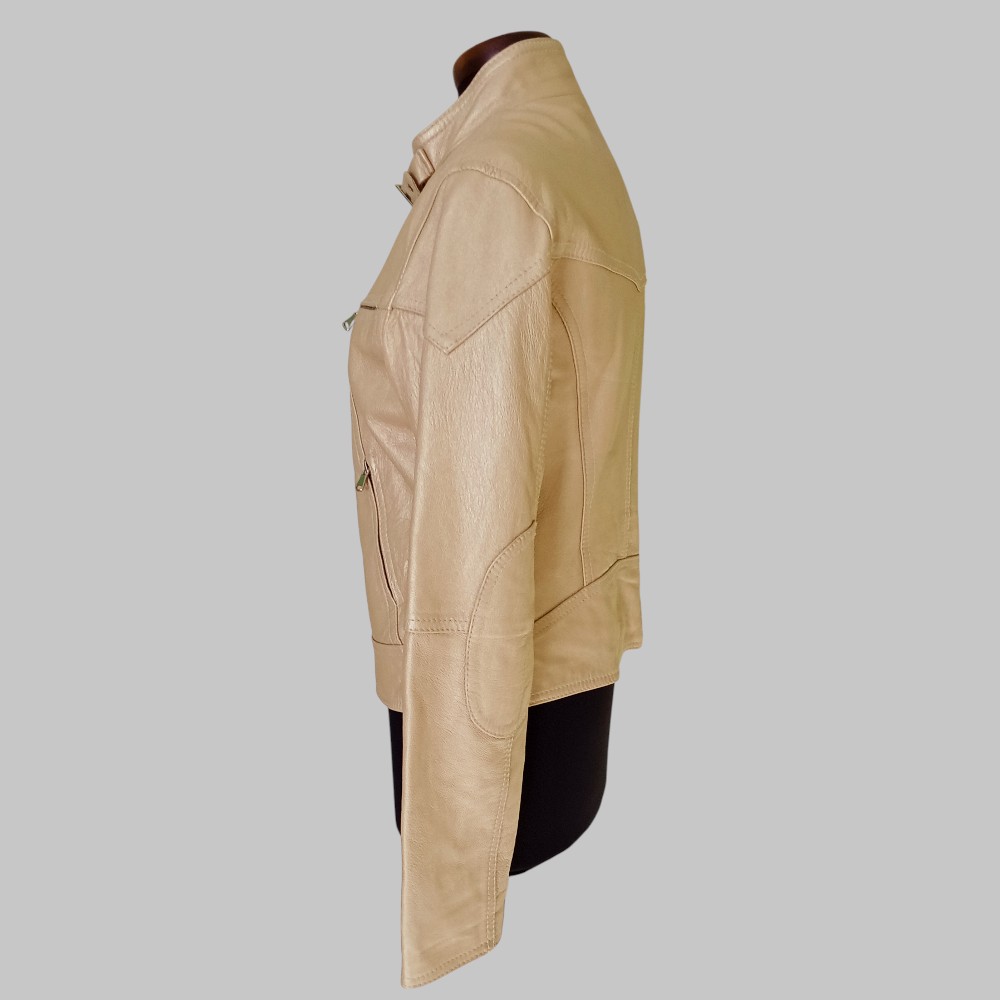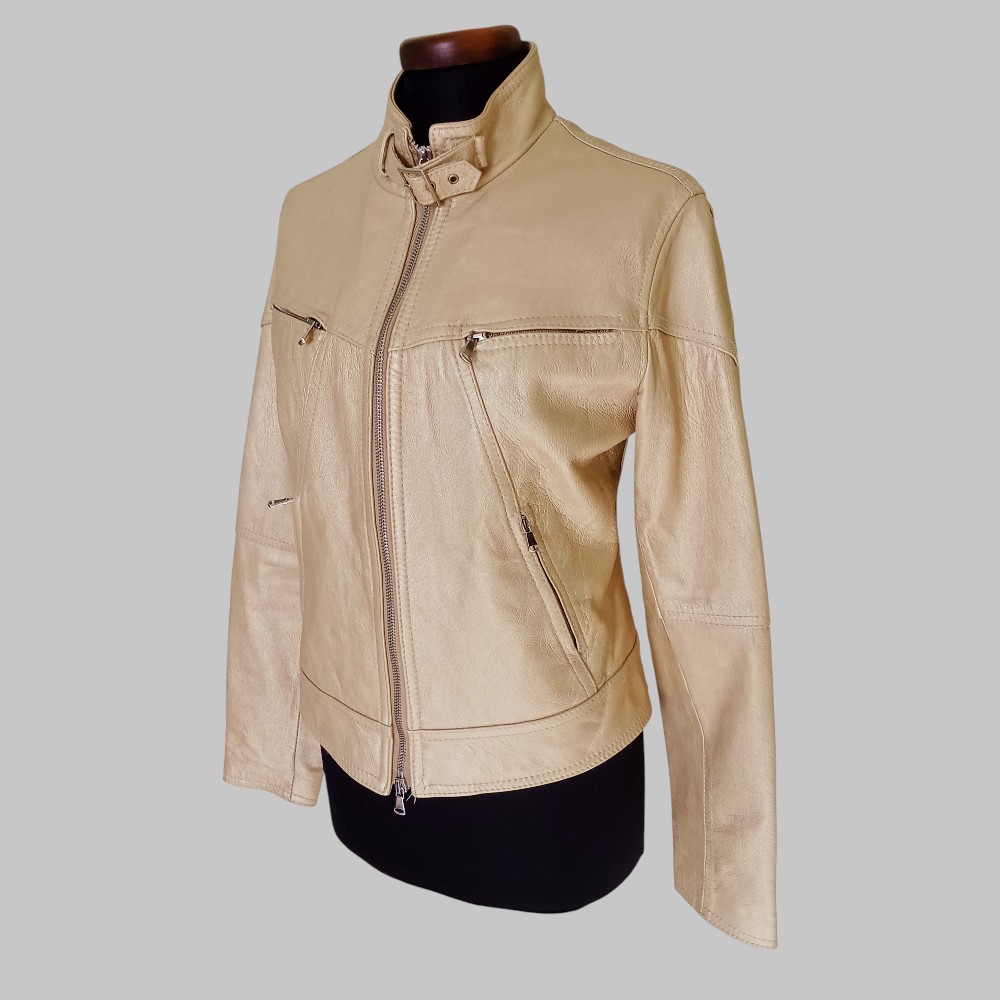 100% Vera Pelle. Giubbino stile biker color oro. Chiusura frontale con zip. Quattro tasche, inserti a toppe sui gomiti