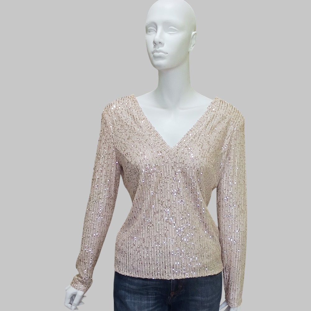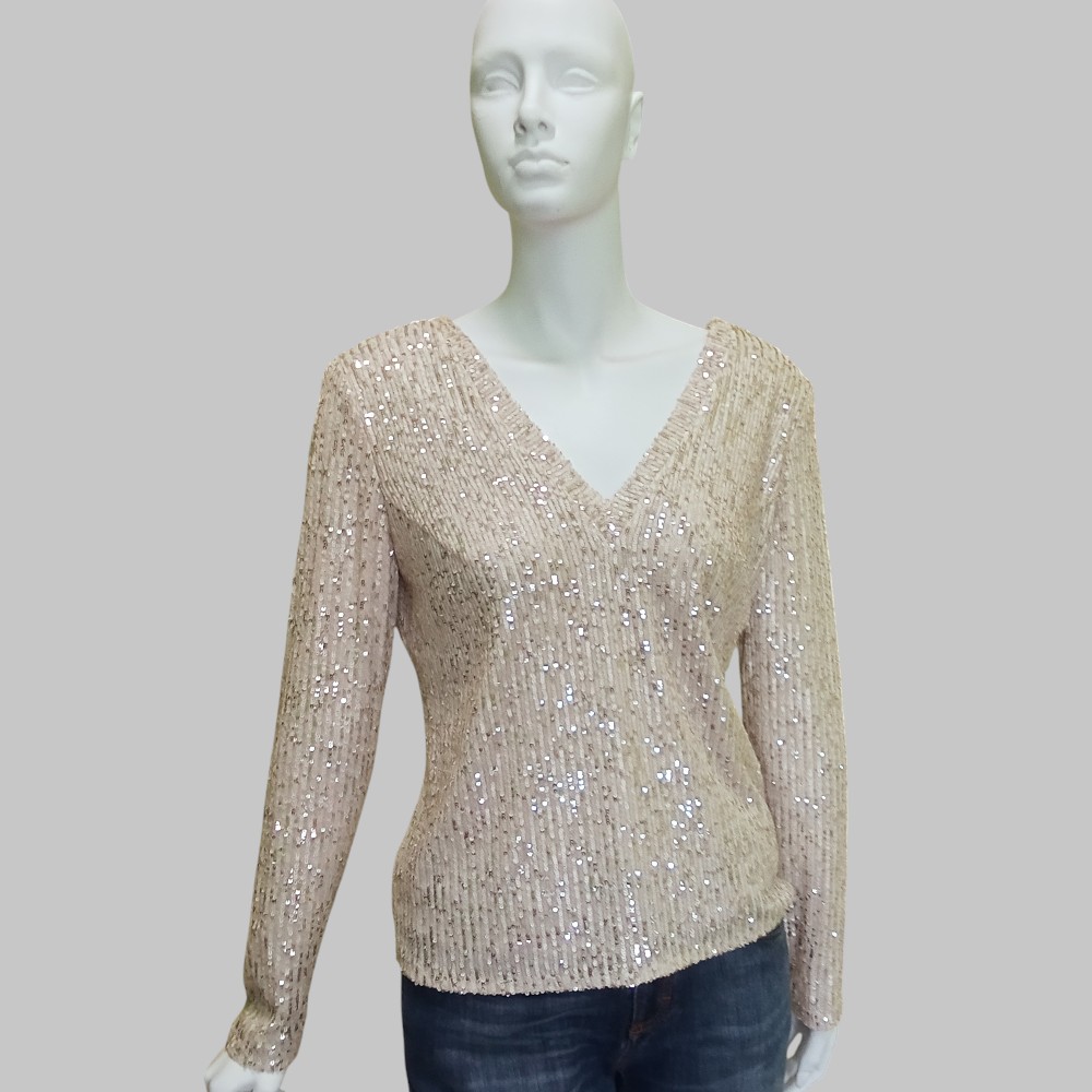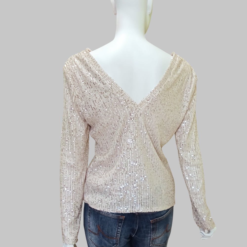 Pullover paillettato scollato fronte e retro. Manica lunga. Il pullover è abbinato al pantalone Mocky Cod. 1516