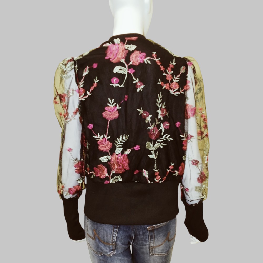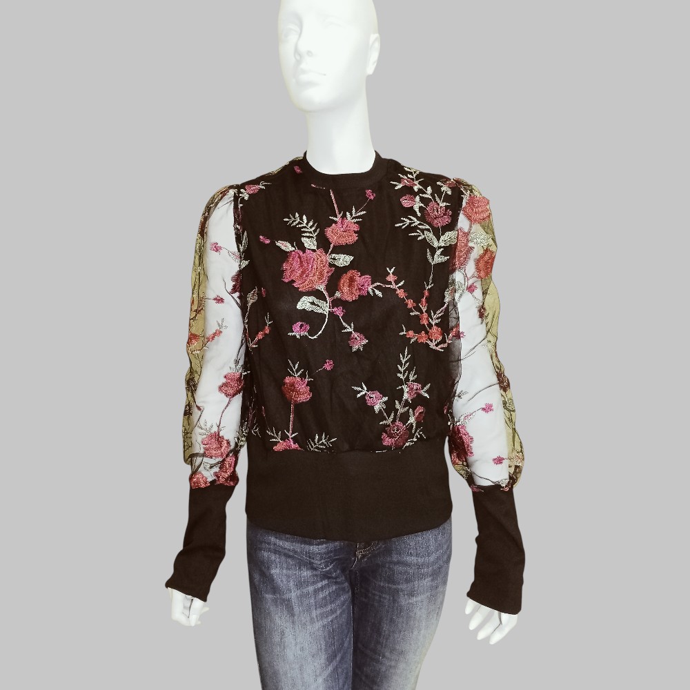 Maglia in tulle con ricami floreali. Collo tondo. Maniche a palloncino trasparenti con polsini alti