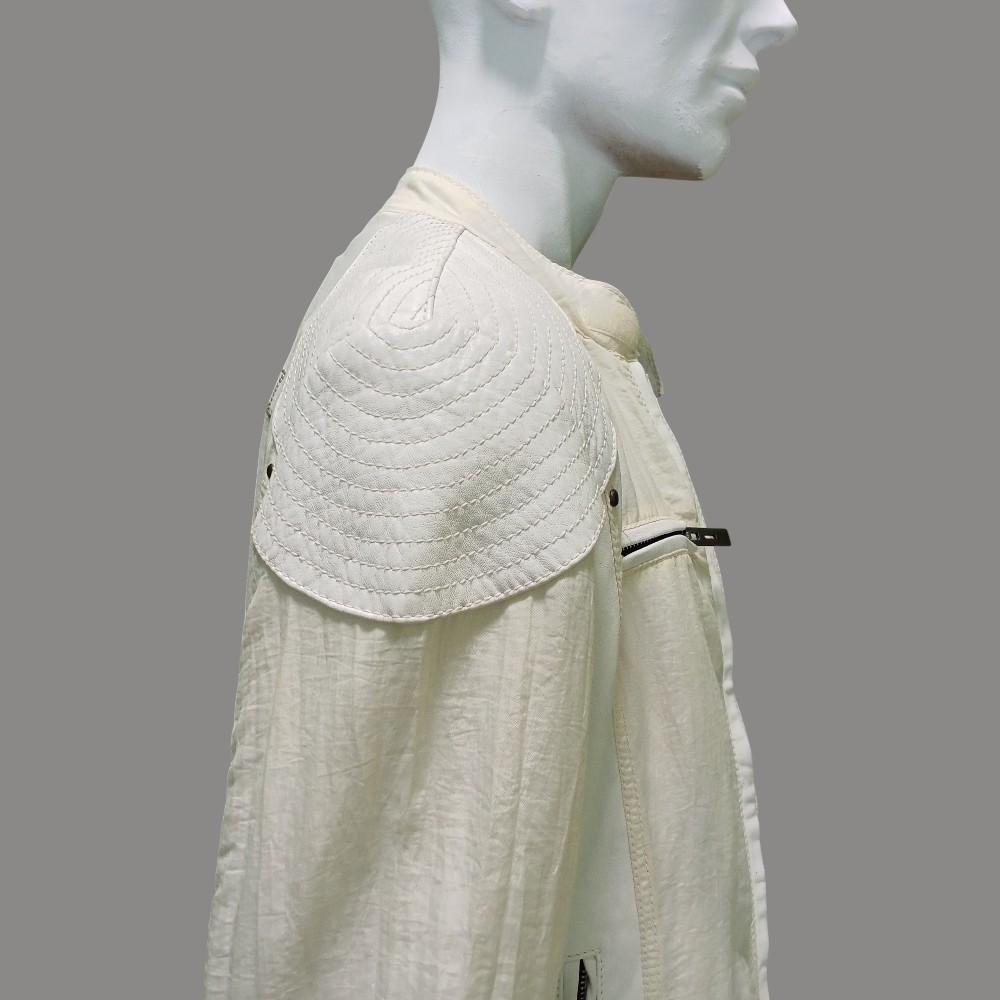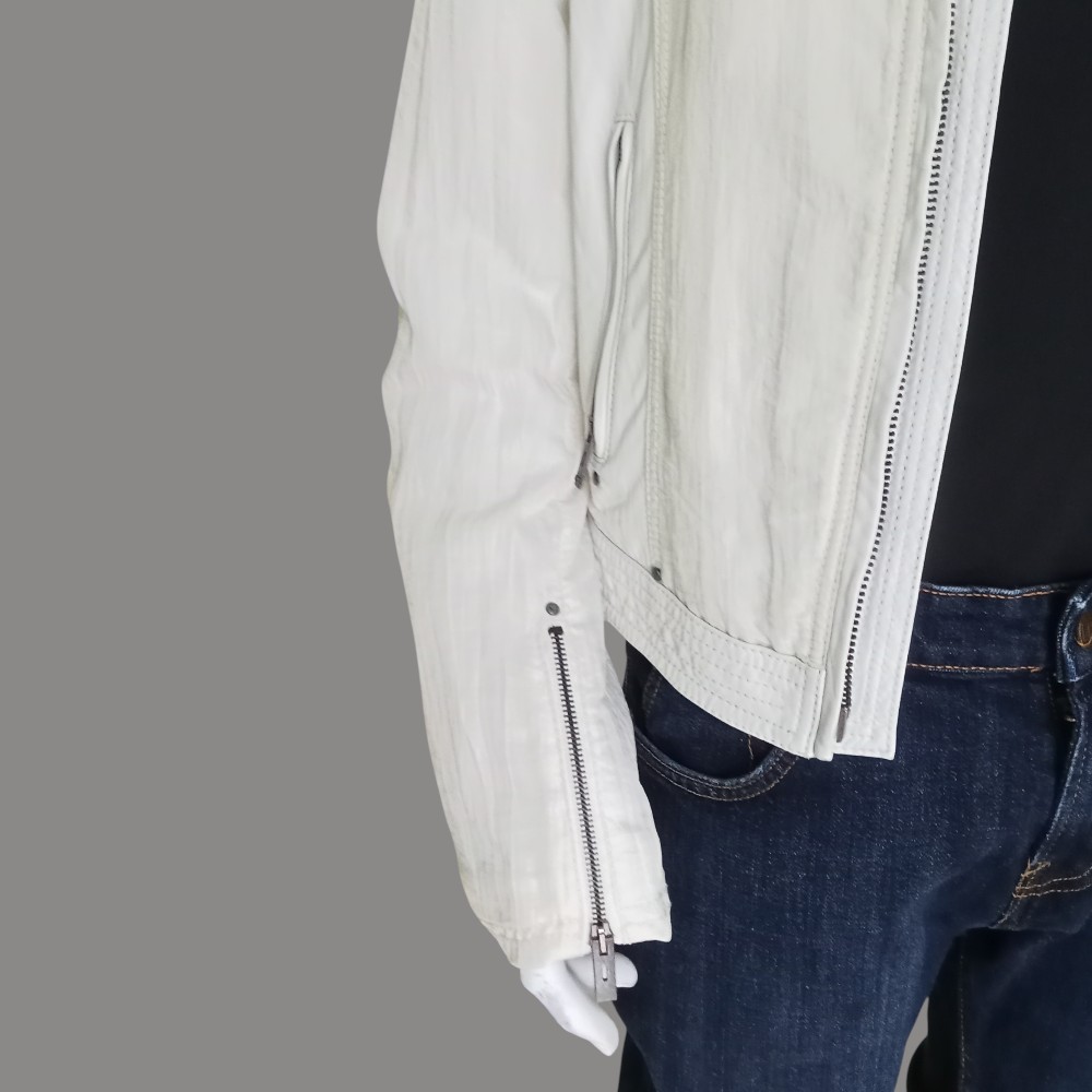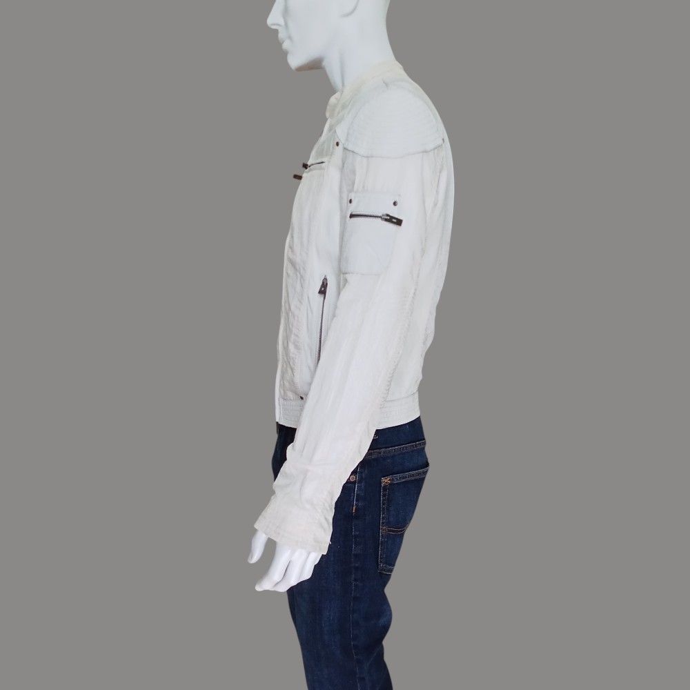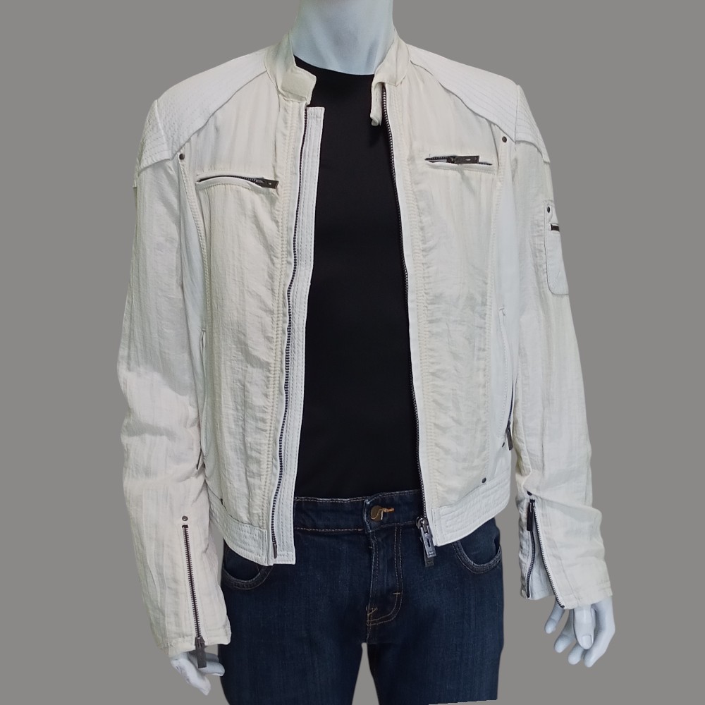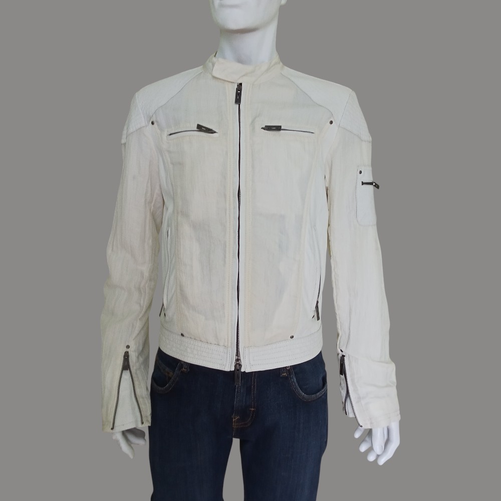 Pelle. Autunno/ Inverno. Giubbino in pelle e tessuto impermeabile style biker. Foderato con due taschini interni. Cinque tasche esterne con zip. Polsini con chiusura zippata. Logo sul retro. Leggermente ingiallito dal tempo. Presenta due minuscoli buchetti all’interno della fodera. Chiusura con zip