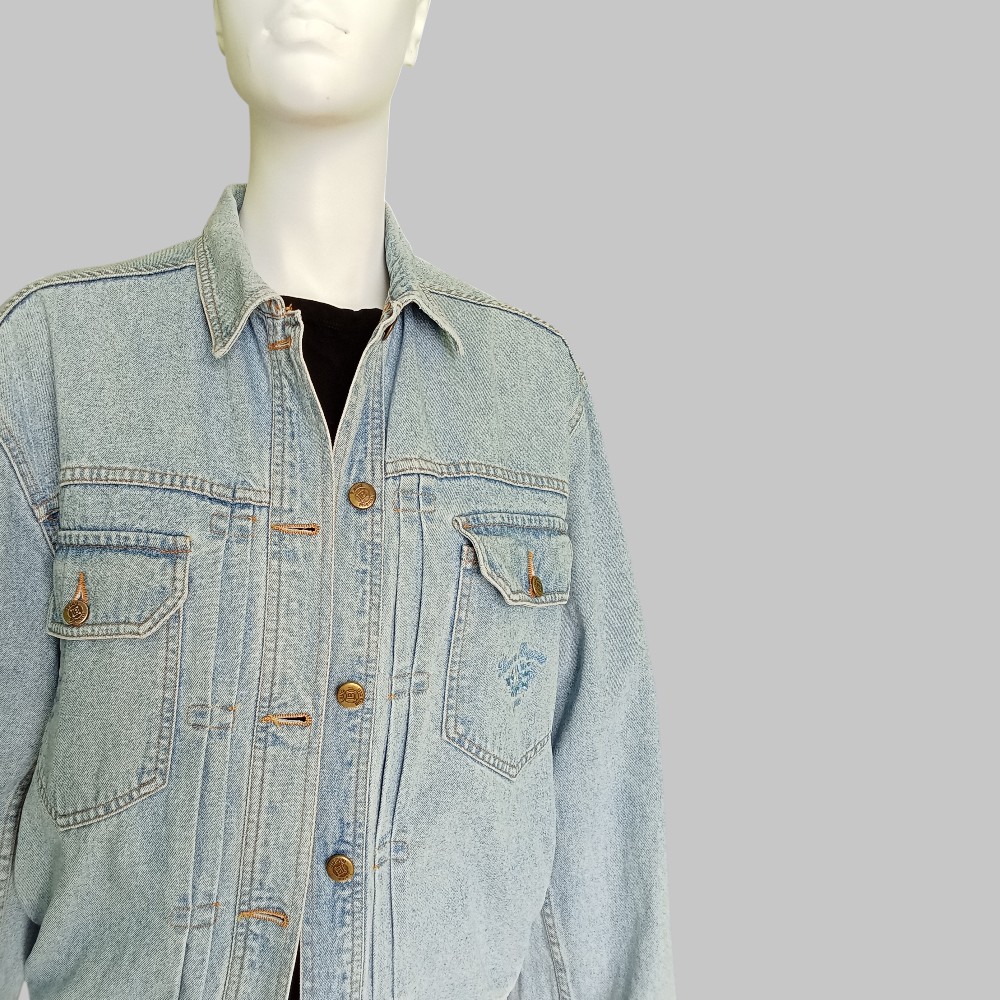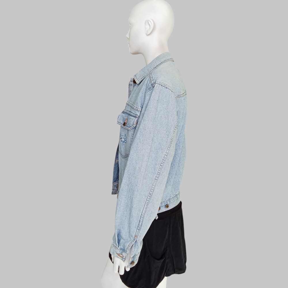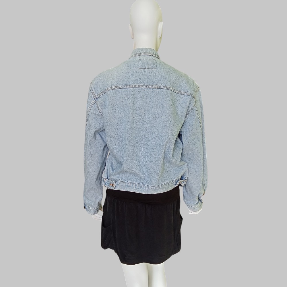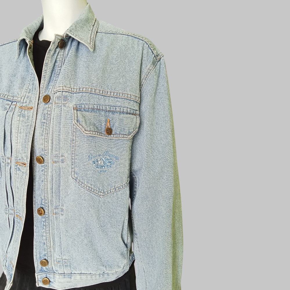 Laura Biagiotti – Giubbino in denim anni 80. Vestibilità dritta a stringhe sui fianchi con ricamo sul taschino e leggermente plissettato sul davanti. Quattro tasche.