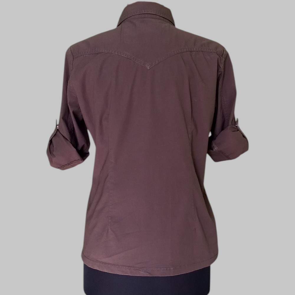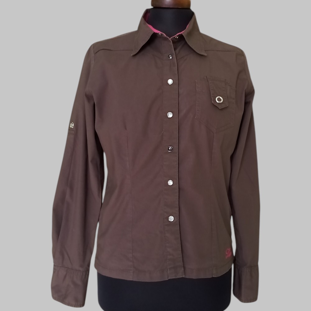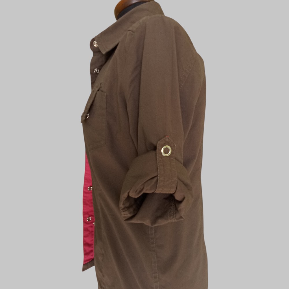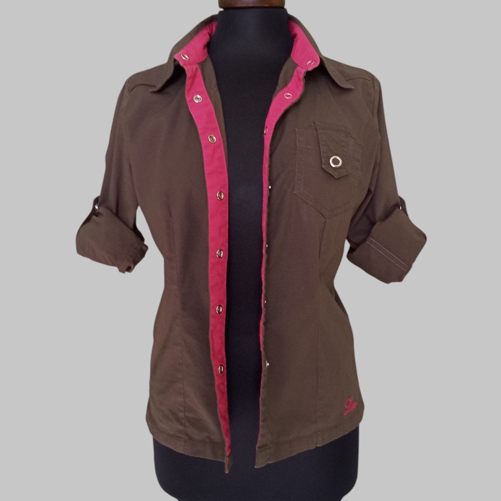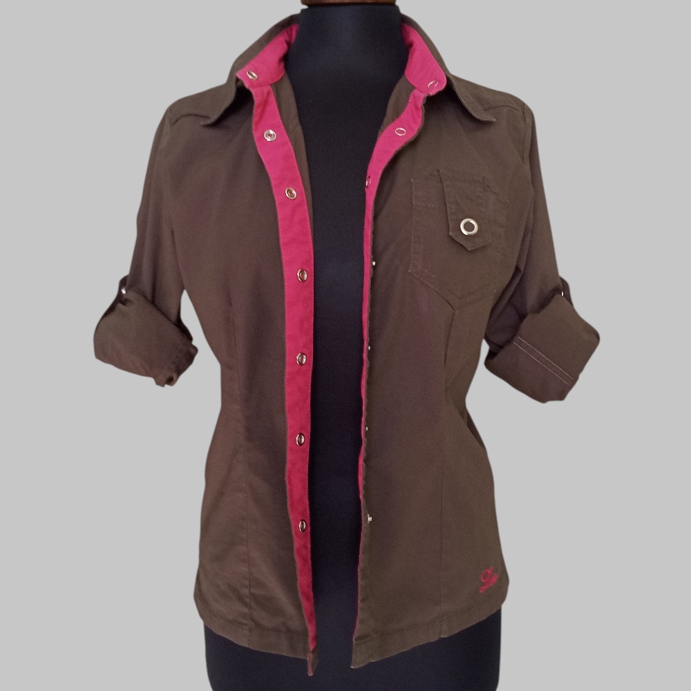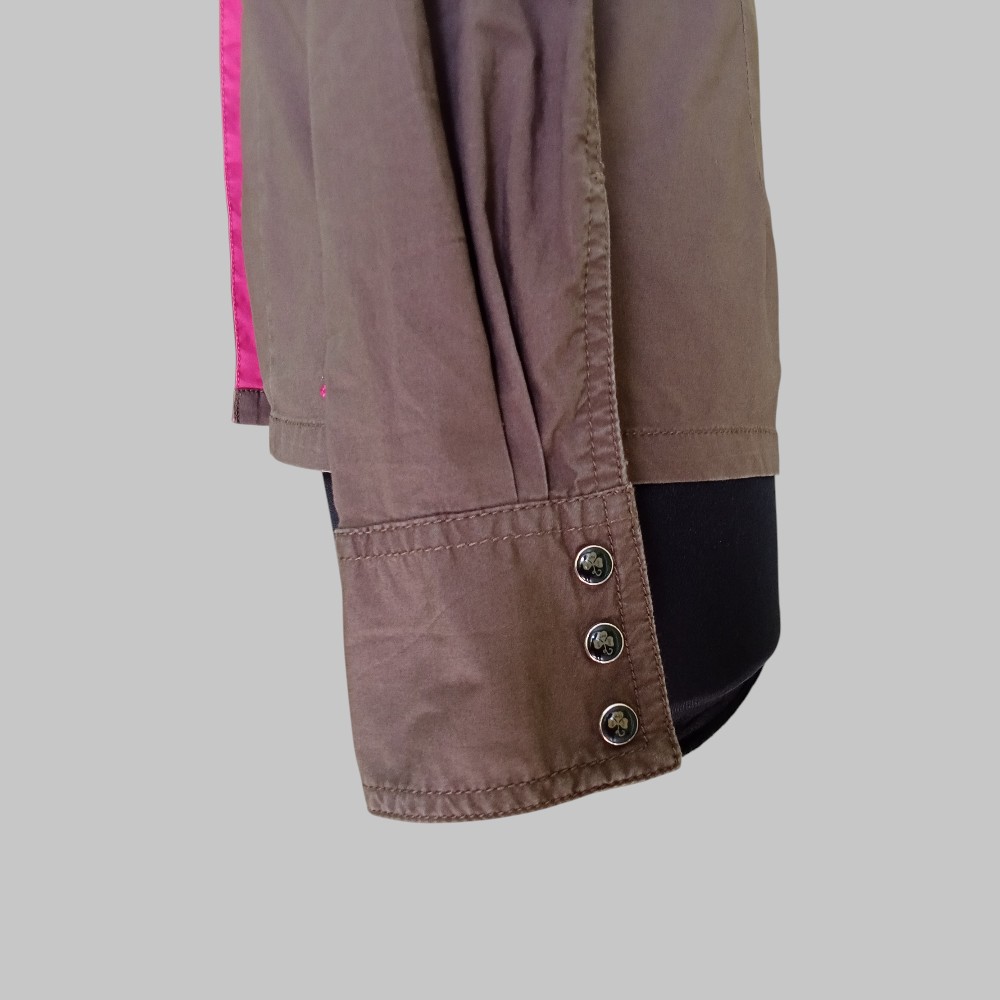 Camicia vintage marrone con inserti fucksia Bottoni a clips. Manica lunga con patta interna per mantenere manica arrotolata