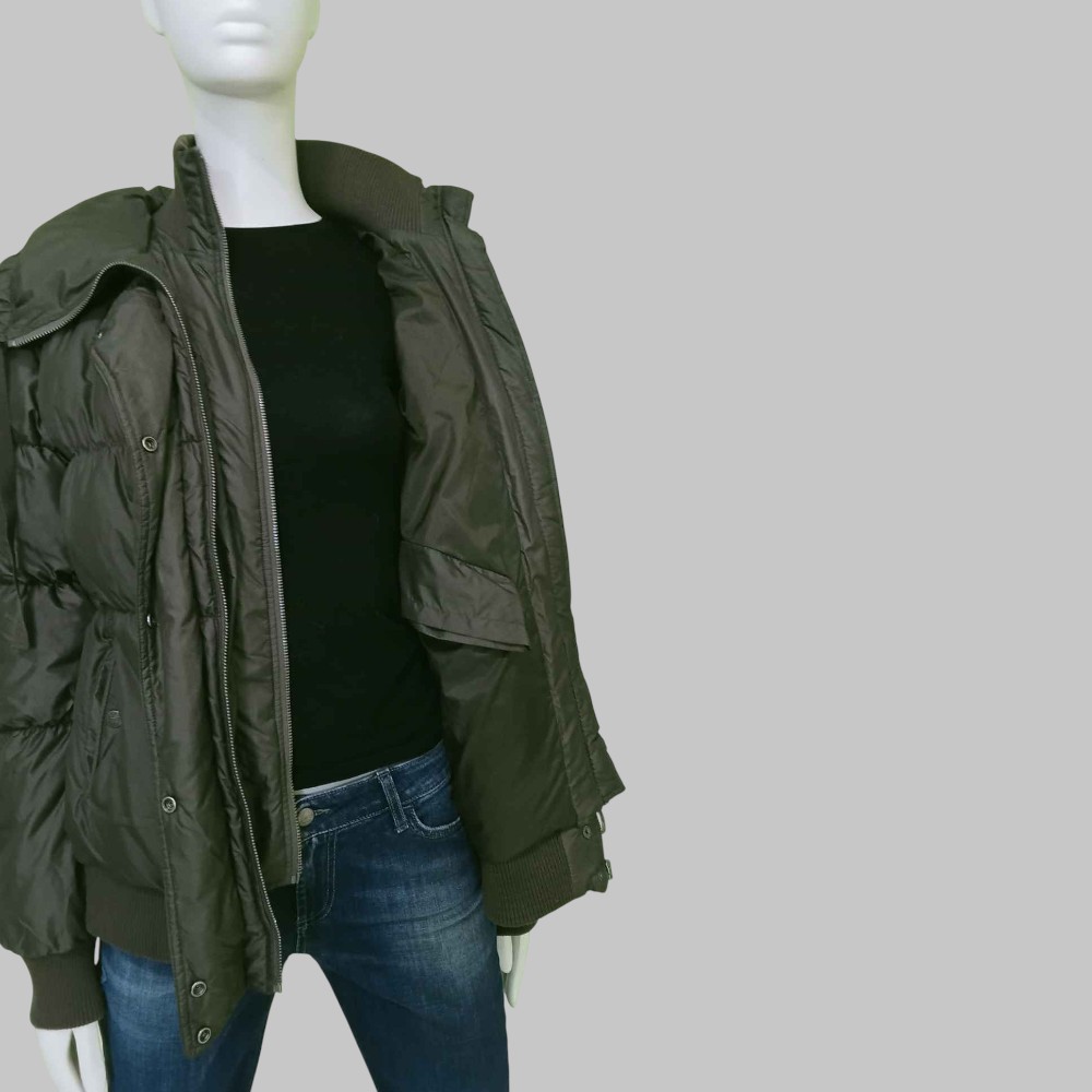 Giacca in piuma d’oca, foderato, un taschino interno, doppia chiusura con zip e clip, doppio collo, due tasche esterne, tinta unita, logo, manica con cerniera ai polsi