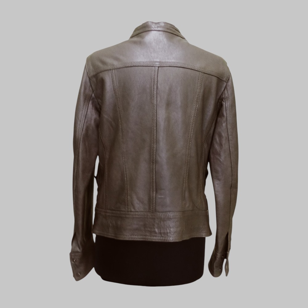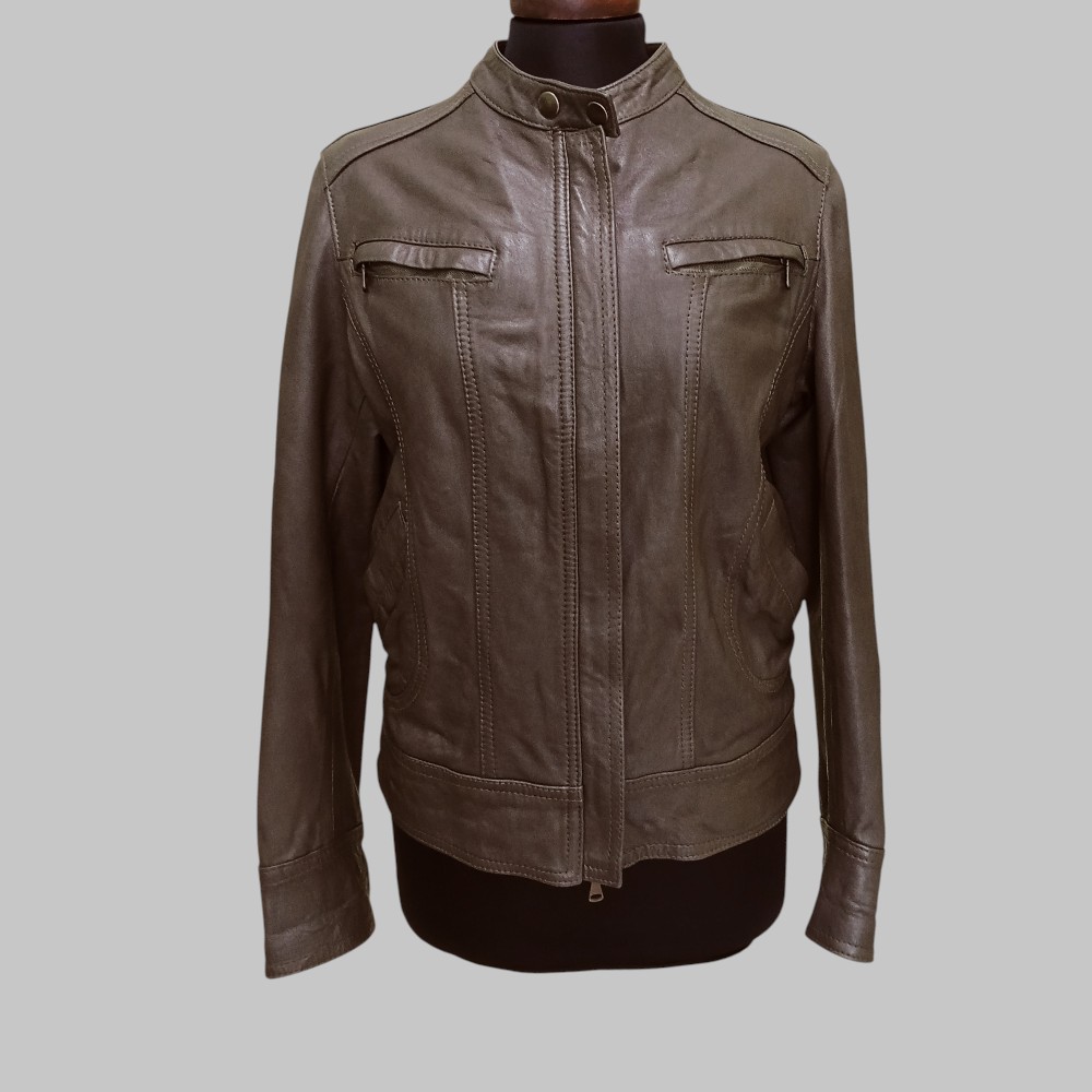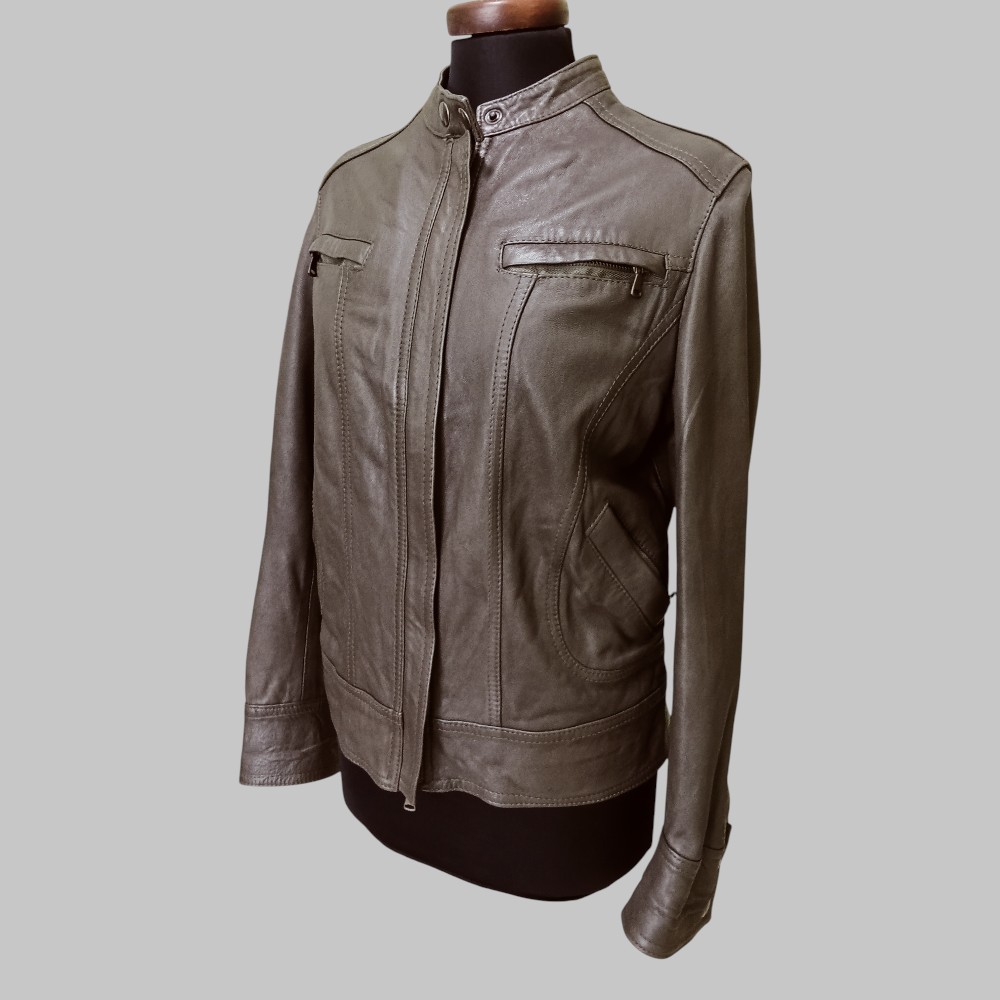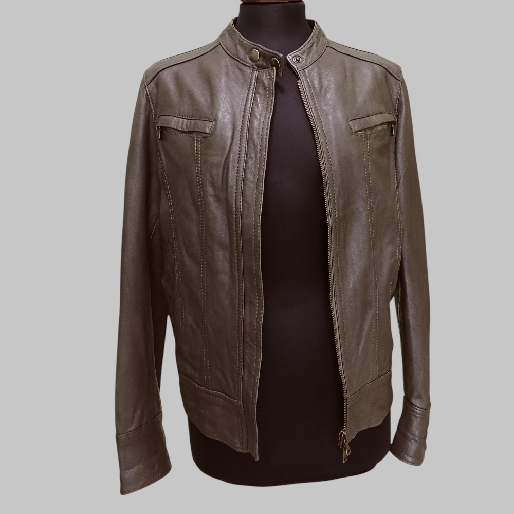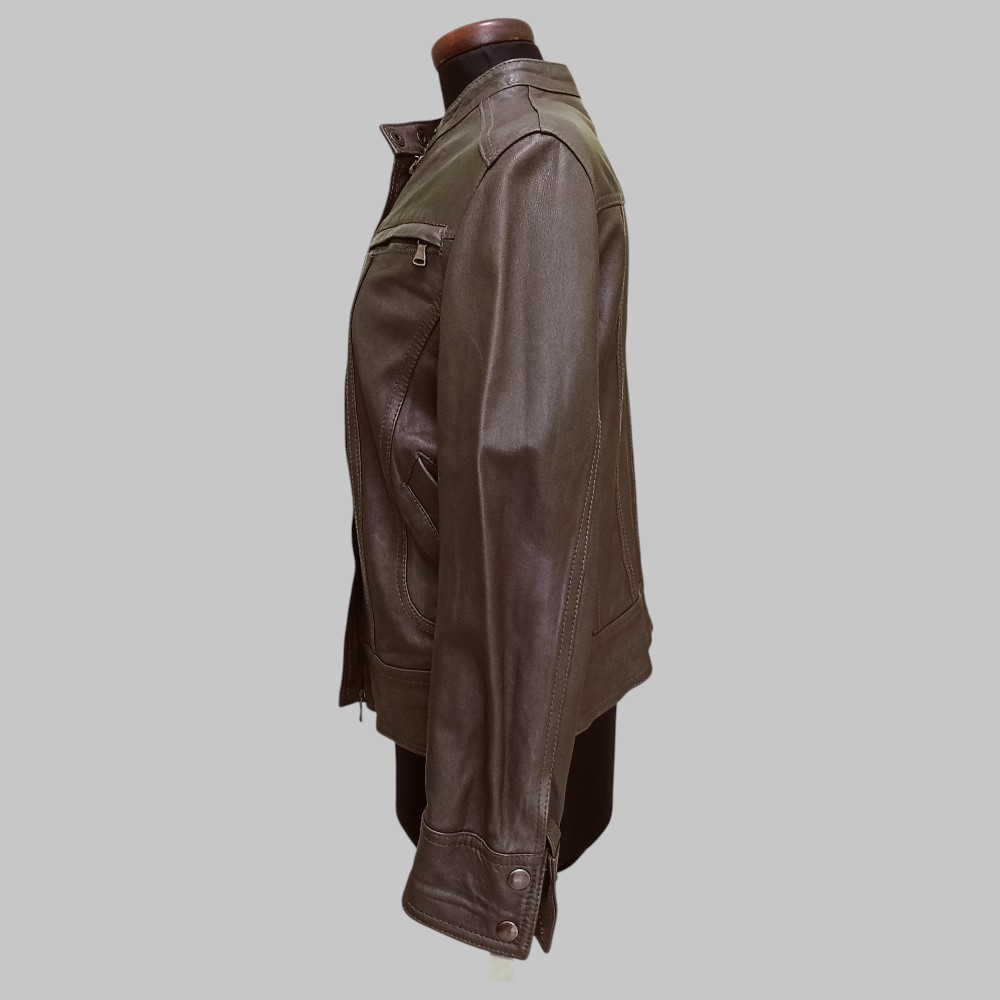 Pelle. Giubbino in pelle modello biker senza applicazioni Tinta unita Foderato Multitasche Chiusura con zip, collo tondo con bottone a clip
