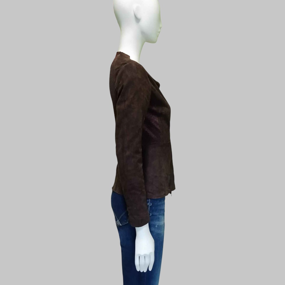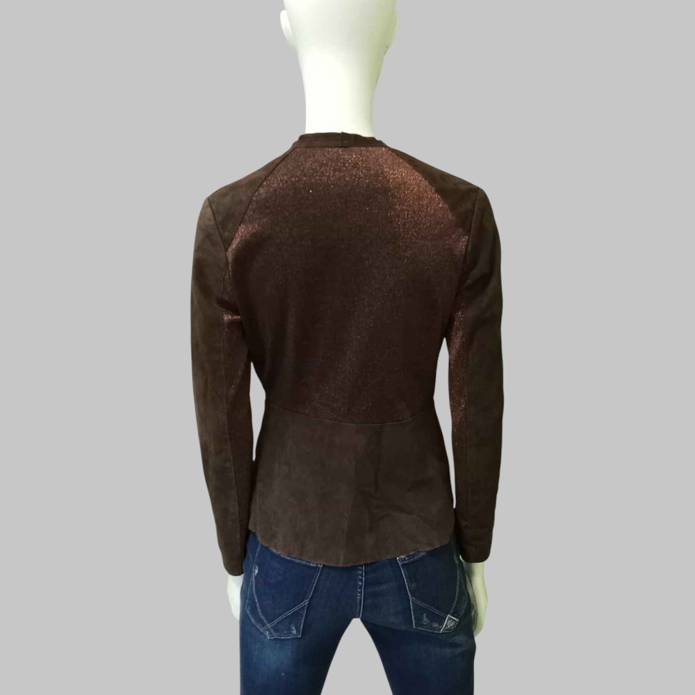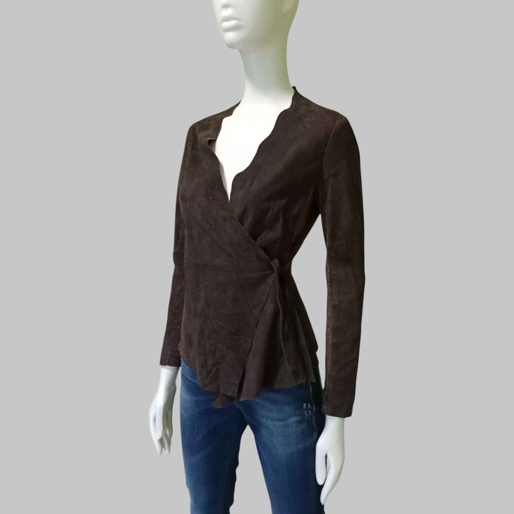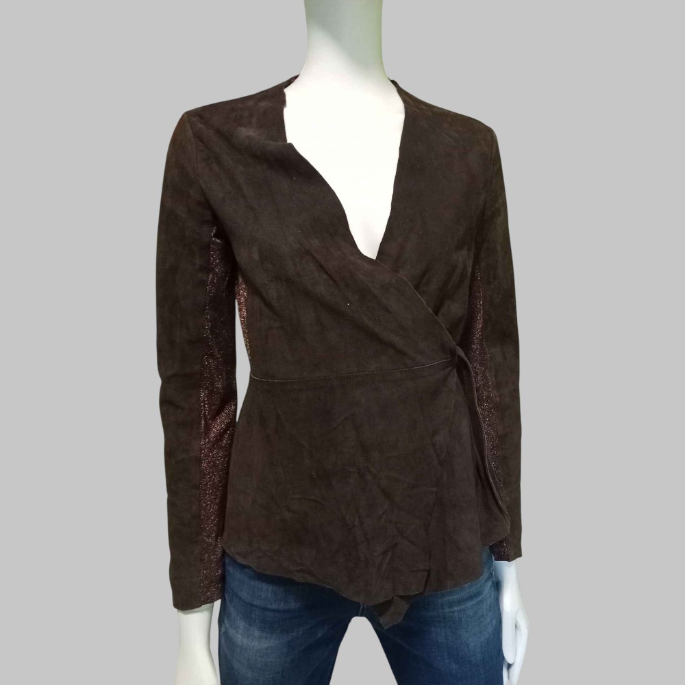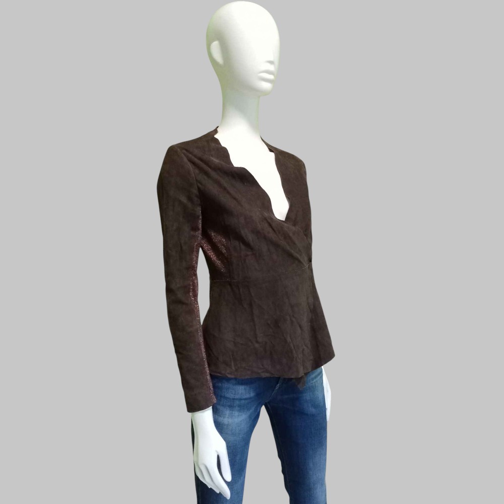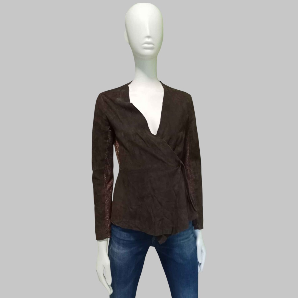 Blusa in pelle scamosciata e tessuto laminato, chiusura a vestaglia con laccetto in pelle