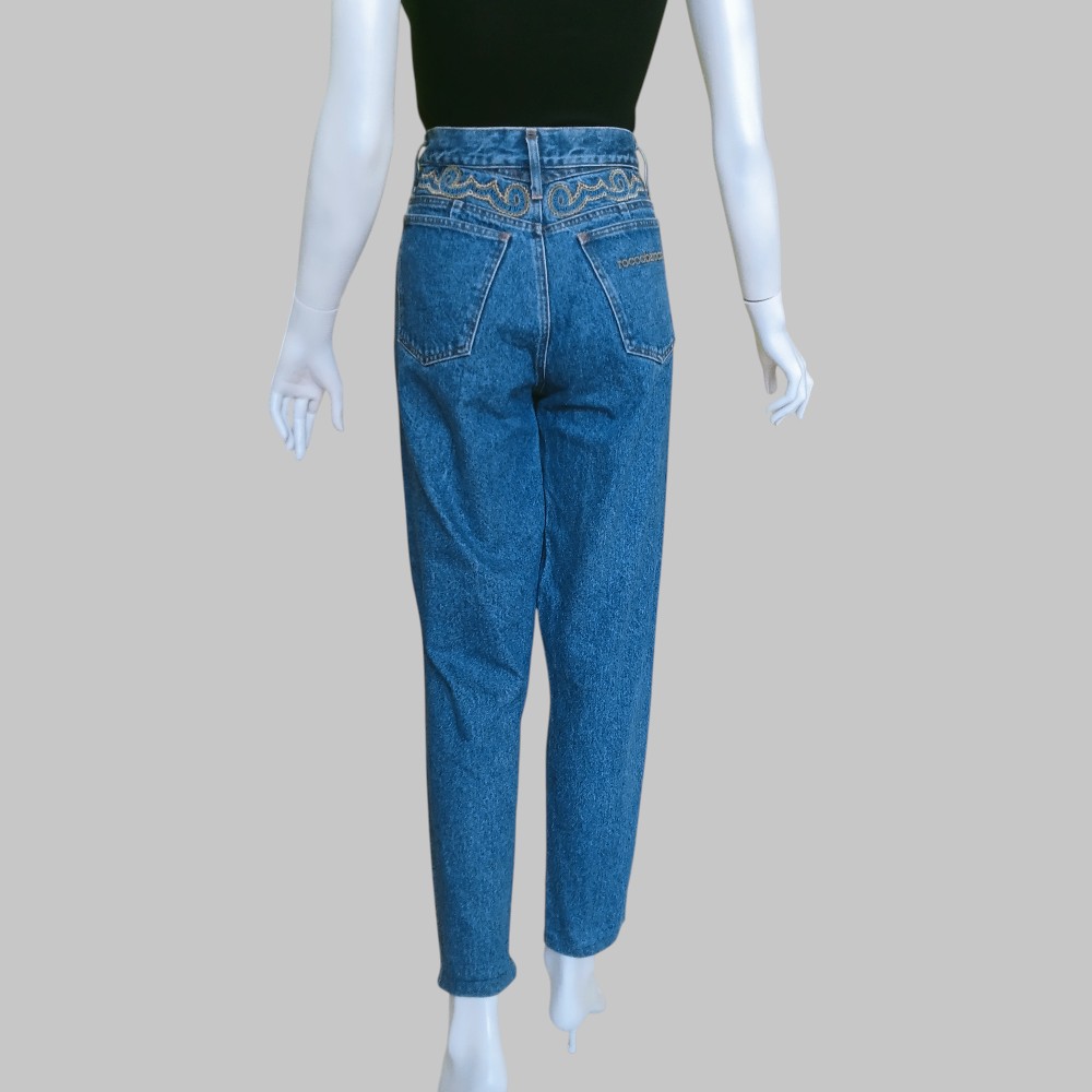 Jeans anni 90 modello Mom Fit vita alta e gamba a cono  Quattro tasche Ricamo  su tutto il girovita e logo sulla tasca