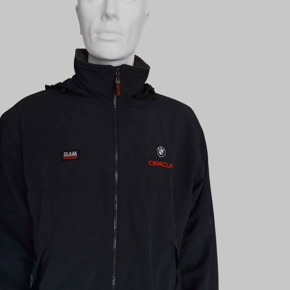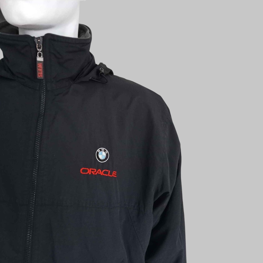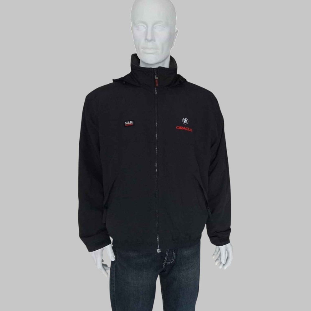 Giacca a vento pesante  collezione BMW ORACLE Racing . Tessuto tecno, due tasche esterne ed una interna, collo con cappuccio, monopetto Chiusura con zip, interno foderato in pile. Logo frontale, retro e manica. Logo catarifrangente sul retro del collo