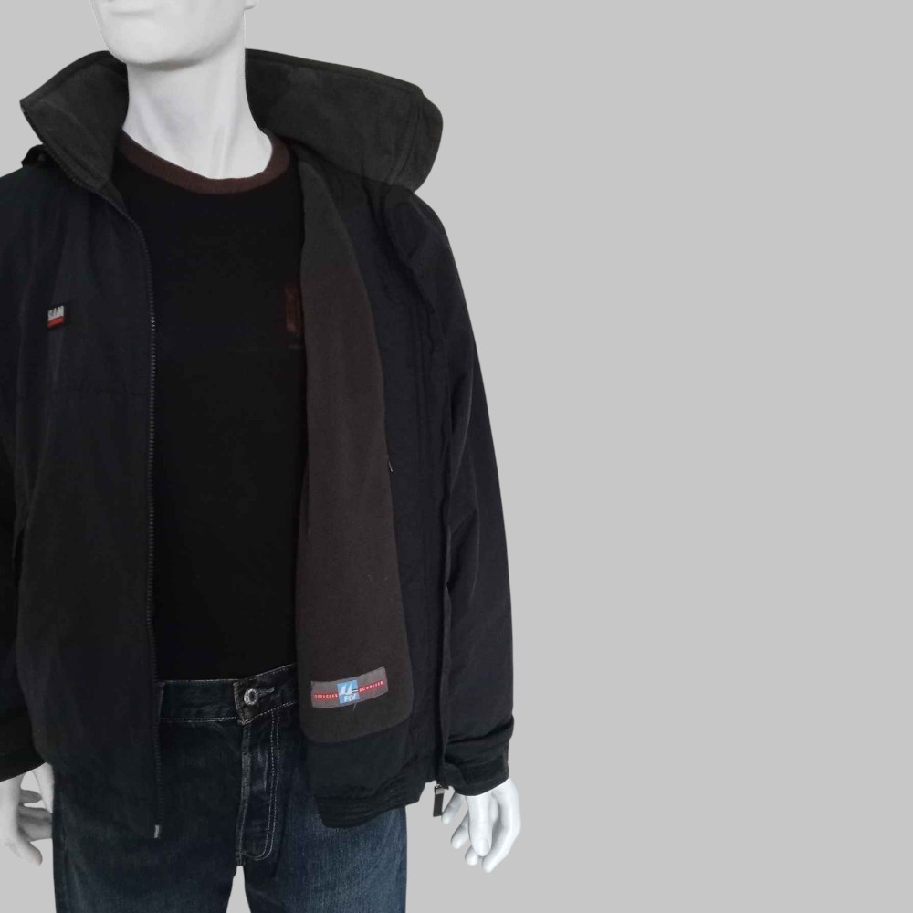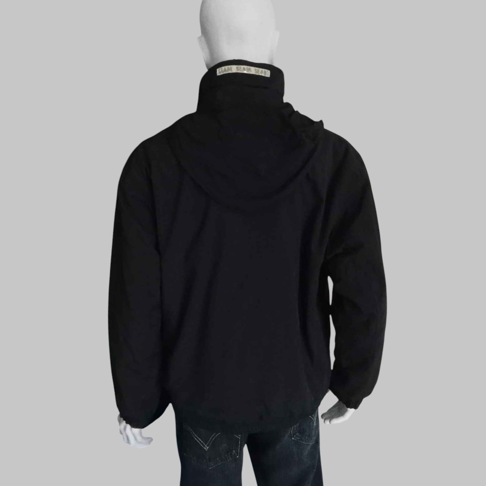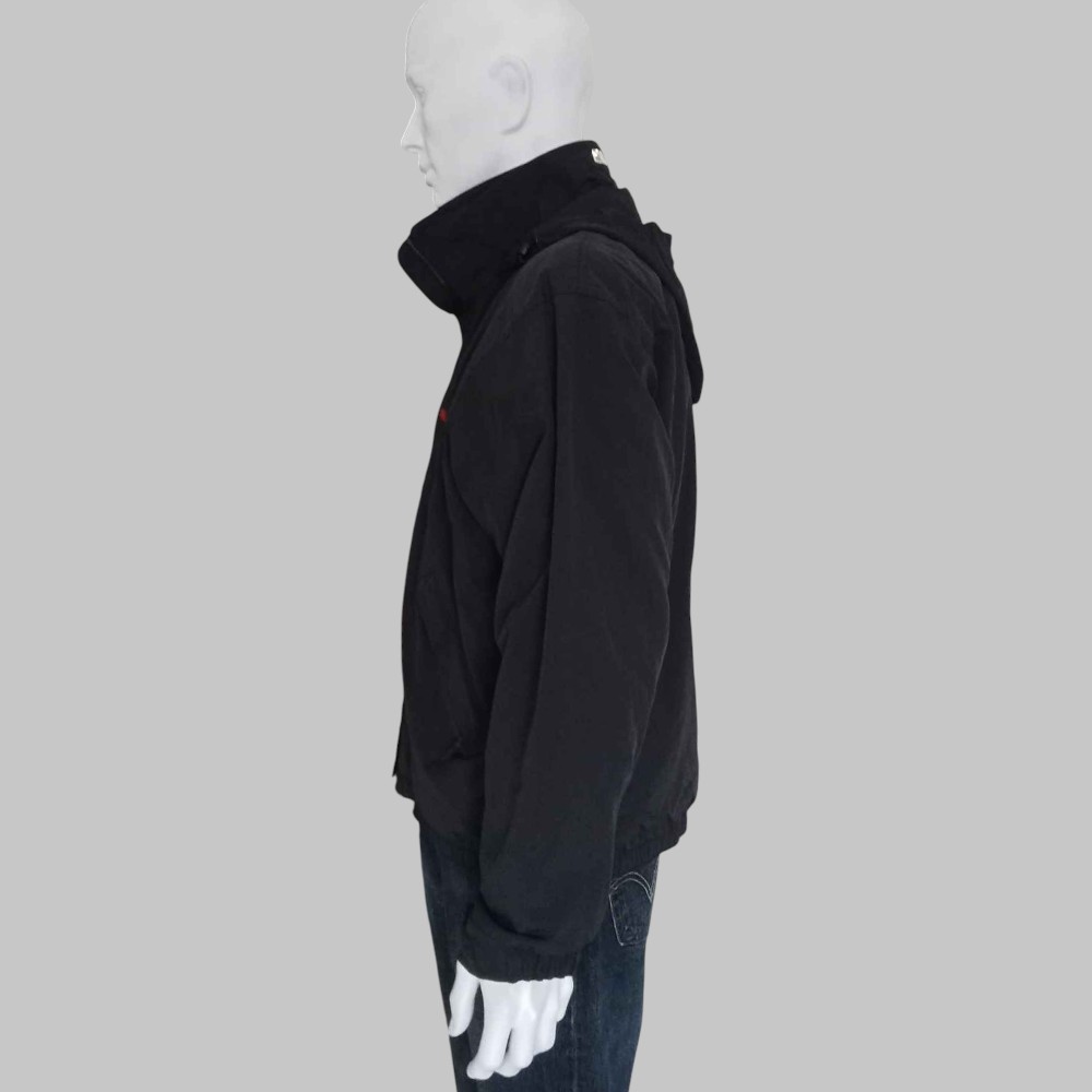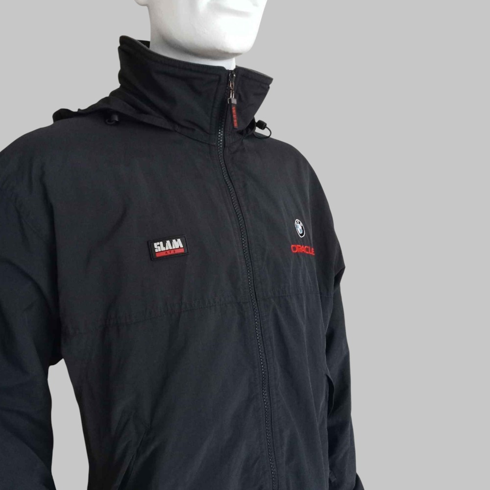 Giacca a vento pesante  collezione BMW ORACLE Racing . Tessuto tecno, due tasche esterne ed una interna, collo con cappuccio, monopetto Chiusura con zip, interno foderato in pile. Logo frontale, retro e manica. Logo catarifrangente sul retro del collo