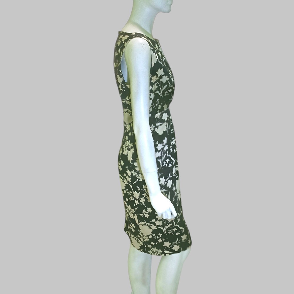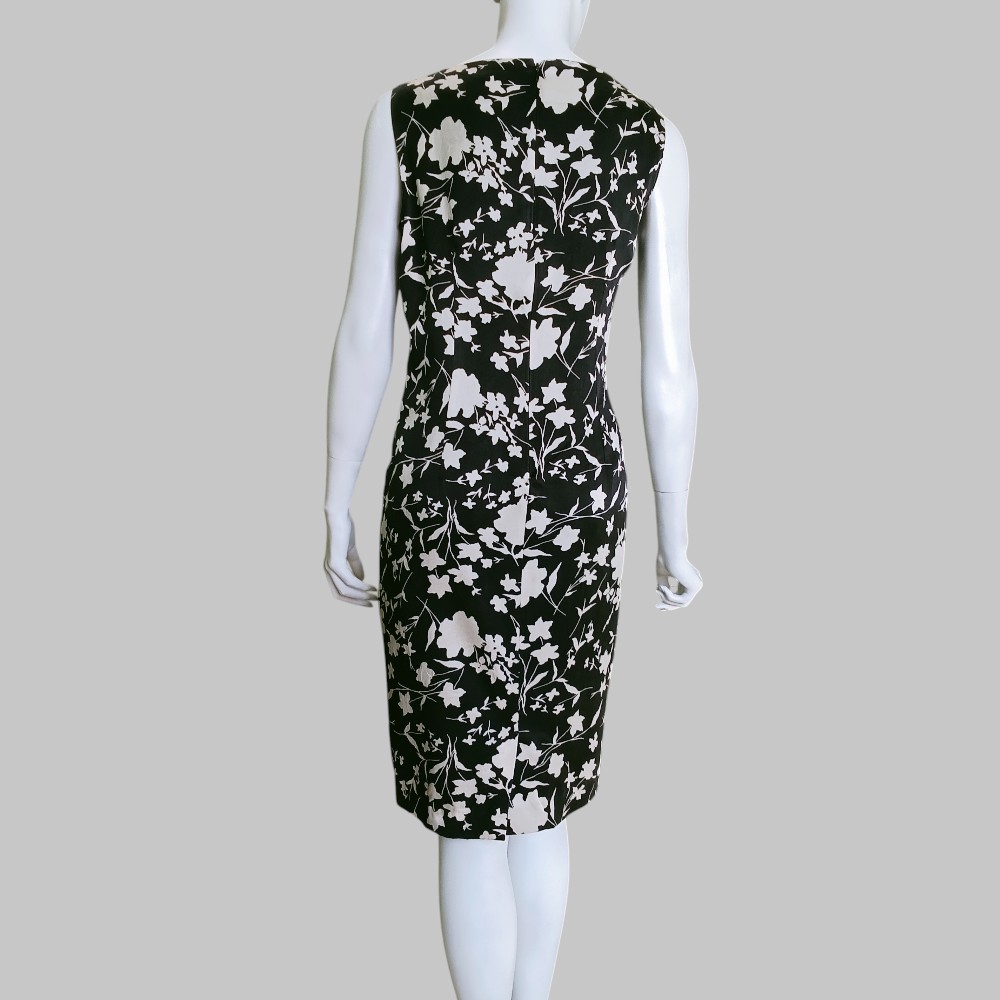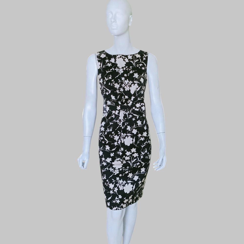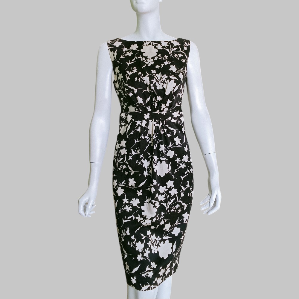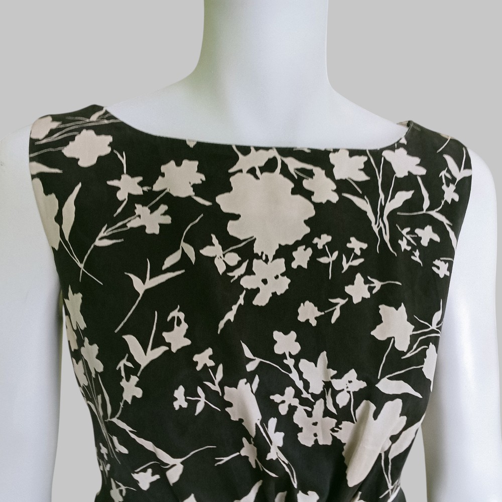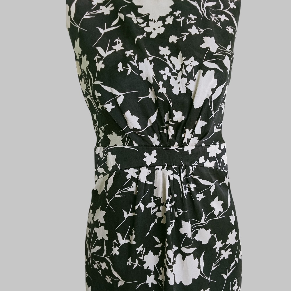 Tubino blue in seta stampata a fiori bianchi.Plissettato in vita. Collo tondo. Manica a giro.Spacco sul retro