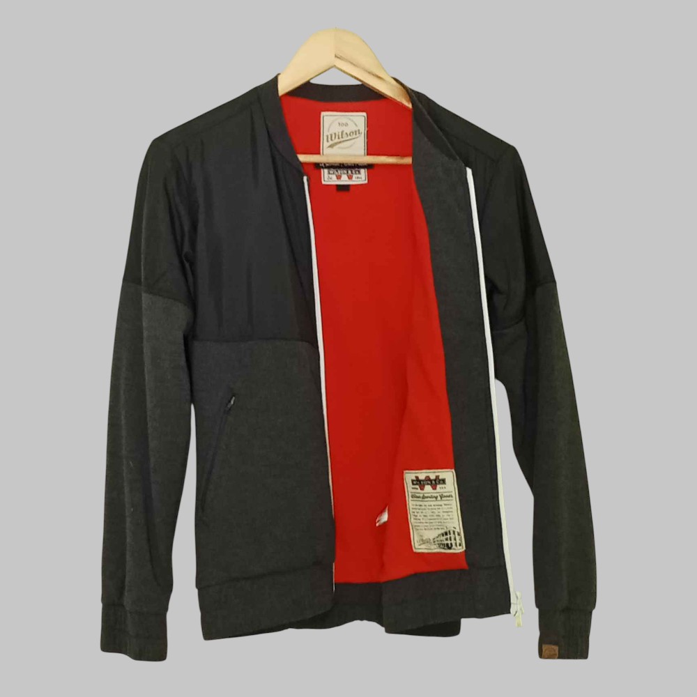 Giacca bomber in maglia tecnica con fodera interna felpata di colore rosso, con inserti, due tasche,  cerniera frontale, polsini e fondo elasticizzati